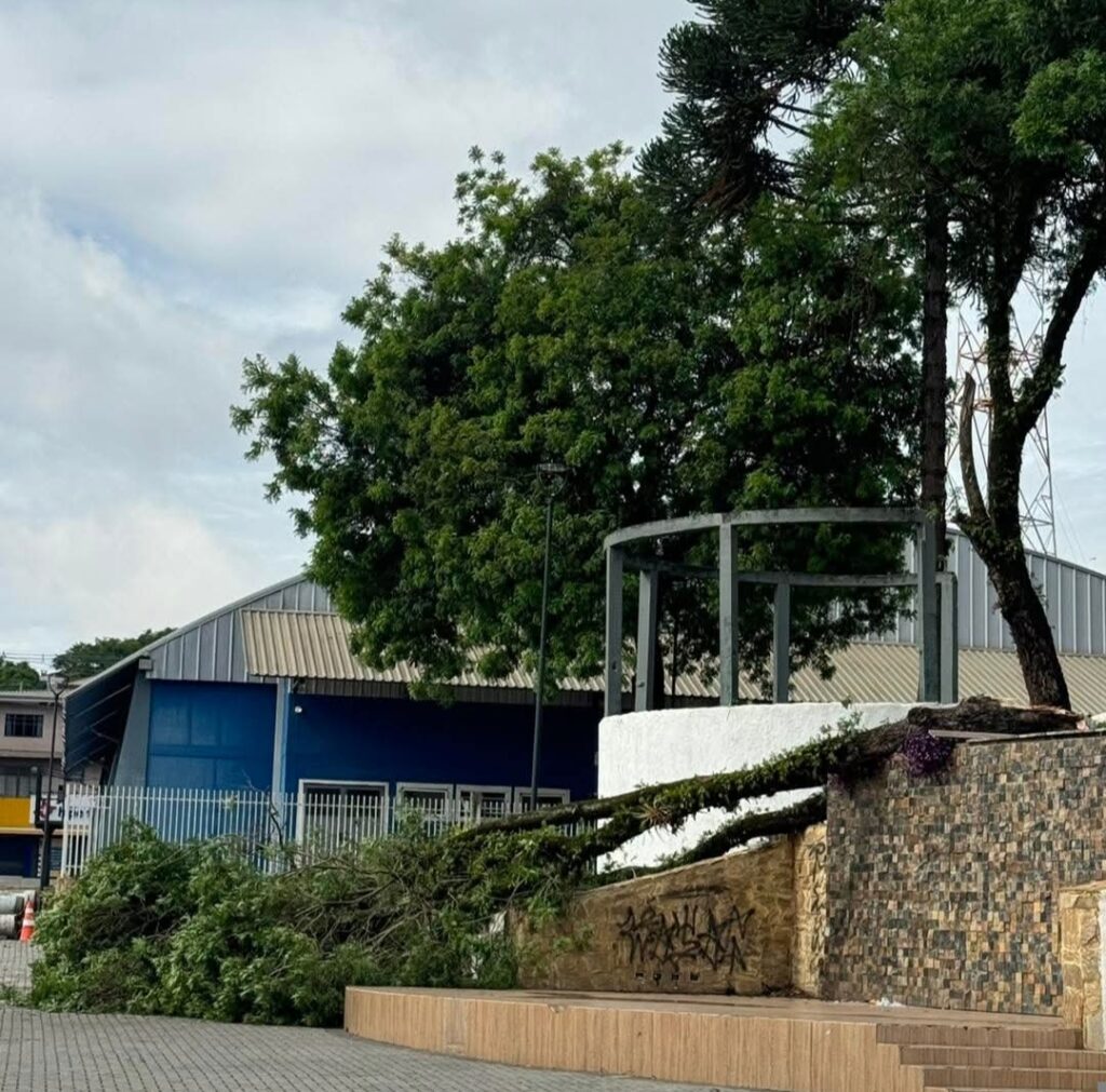 Na praça da Vila Velha, uma árvore foi derrubada pela combinação de chuvas intensas e ventos fortes na tarde deste sábado. A precipitação, que durou poucos minutos, também foi marcada pela formação de um tornado em São José dos Pinhais. Esses eventos refletem a intensidade das chuvas típicas do verão. Fonte: Jornal Expresso