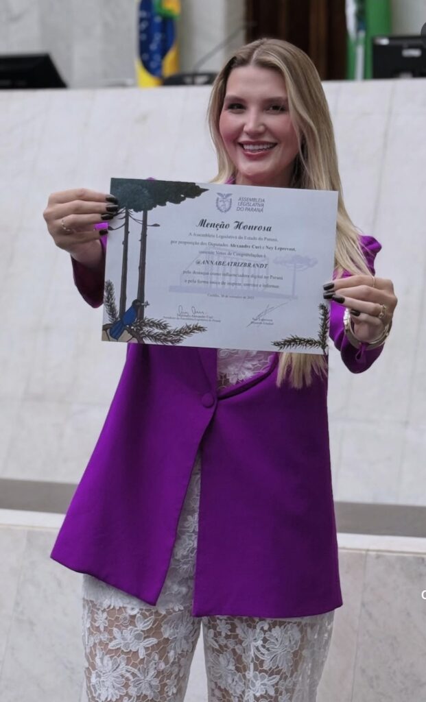 ANNA BEATRIZ BRANDT, DE RIO BRANCO DO SUL, RECEBE HOMENAGEM NA ASSEMBLEIA LEGISLATIVA DO PARANÁ